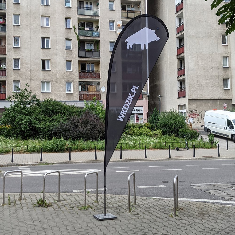 Żagiel reklamowy Slim Half Maxi jest okazałą flagą z nadrukiem, wyróżniającą się z tłumu. Nazwa Maxi wskazuje, że mamy do czynienia z największym rozmiarem i tak jest faktycznie. Komplet składa się z flagi o wymiarach 1,3 x 3,5m, która wraz z masztem osiąga wysokość 4,35m. Stojący żagiel reklamowy sięga więc już standardowego pierwszego piętra i pozwala górować nad głowami przechodniów. Tak okazałe elementy, wyróżniające się są wyjątkowo często stosowane podczas imprez handlowych, wystaw, a także na plażach i dużych przestrzeniach otwartych, gdzie są widoczne z dużych odległości. System jest składany i to do rozmiarów pozwalających na jego łatwy transport samochodem, co jest również jego atutem. Jego rozłożenie trwa średnio kilkanaście minut.