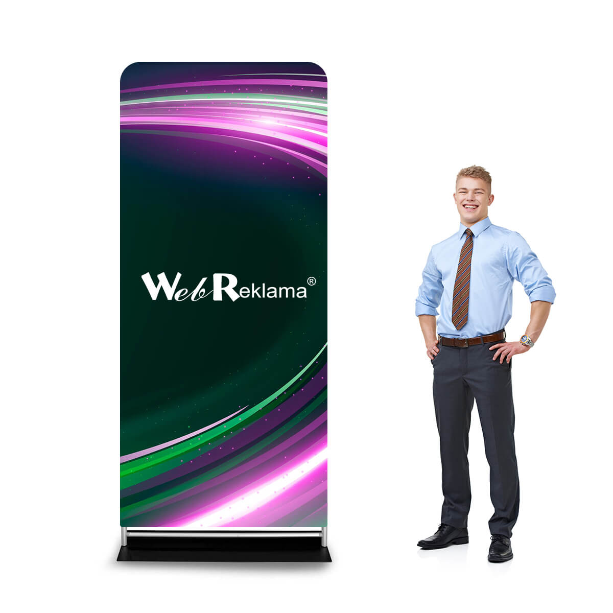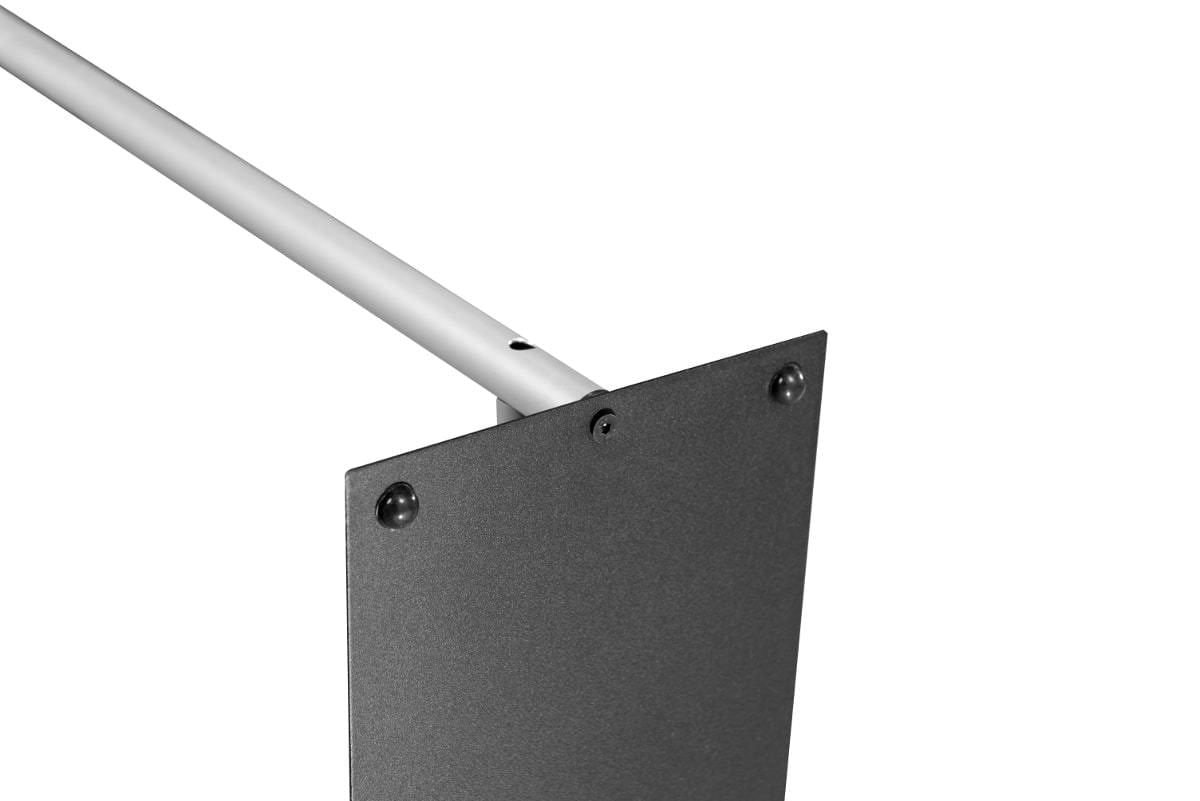 Stand tekstylny 90 x 230 to lekkie i eleganckie narzędzia reklamowe, które doskonale sprawdzi się podczas targów i konferencji. Konstrukcja jest podobna, jak w przypadku ścianek tekstylnych, gdzie grafikę naciągamy na stelaż od góry. Jedyną różnicą między standami tekstylnymi a ściankami jest wymiar oraz brak nóżek, które zastąpione są przez metalową płytę w kolorze czarnym. Ta nowoczesna konstrukcja zapewnia standom tekstylnym jeszcze większą stabilność. Grafika wydrukowana jest na elastycznym materiale i może być wykorzystana zarówno jedno- jak i dwustronnie.