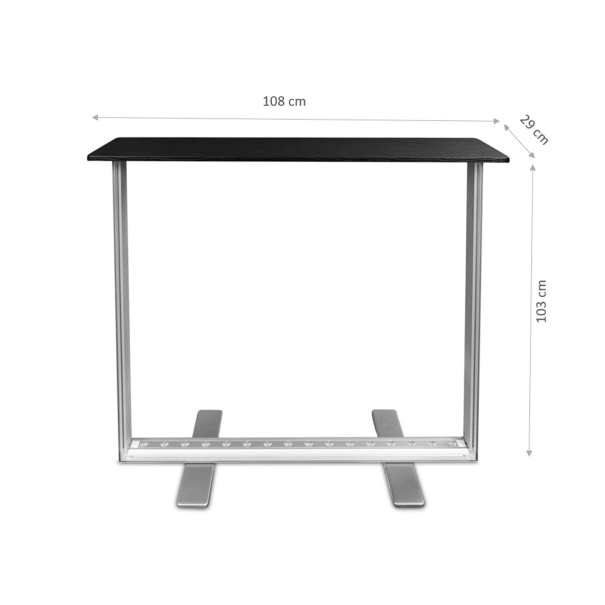 Nietuzinkowa, dwustronna trybunka reklamowa z podświetleniem ledowym. Może być doskonalszą alternatywą dla tradycyjnej lady recepcyjnej czy wystawowej. Trybunka została wykonana z mocnego i grubego aluminium anodowanego, co gwarantuje jej wysoką jakość oraz długotrwałe użytkowanie. Czarny blat z HDFu dodaje elegancji podświetlanej reklamie.