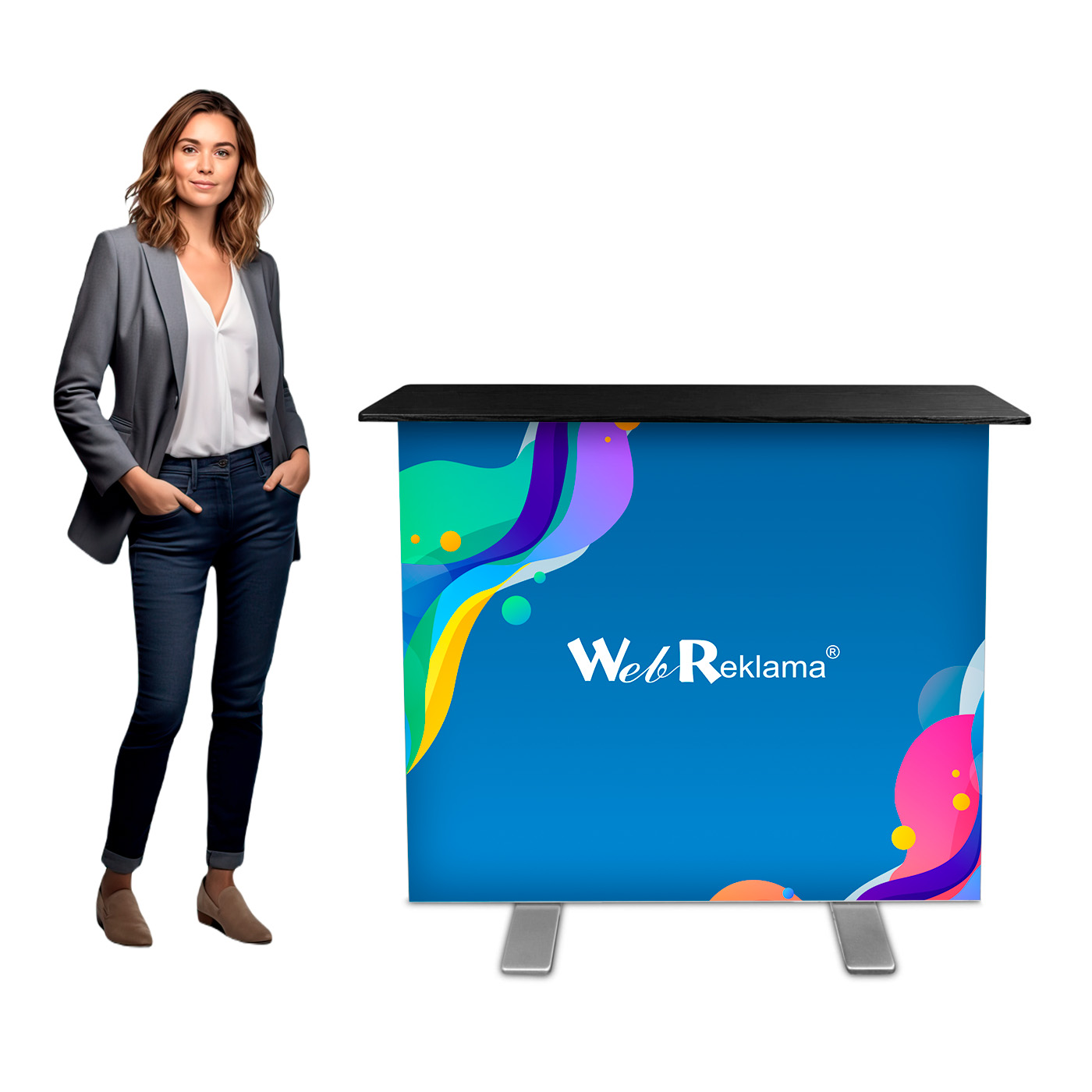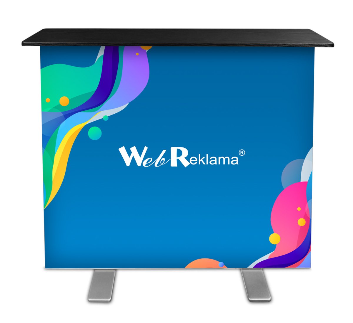 Podświetlana lada targowa jest przenośna i niezwykle prosta w obsłudze, a jej złożenie nie wymaga użycia narzędzi i zajmuje dosłownie kilkanaście sekund. Mocowanie wydruku za pomocą taśmy silikonowej to z kolei pewność błyskawicznego i niezwykle łatwego montażu grafiki reklamowej. Zamontowane w podstawie żarówki LED sprawiają, że cała trybunka jest wspaniale doświetlona i z daleka rzuca się w oczy i zwróci uwagę przechodniów.